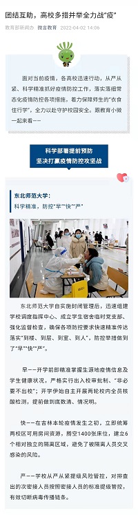 4月2日,教育部官方微信公众号“微言教育”发表了题为“团结互助,高校多措并举全力战‘疫’”的报道,对我校自实施封闭管理以来疫情防控工作的科学部署与提前预防等措施进行了宣传。附:相关报道链